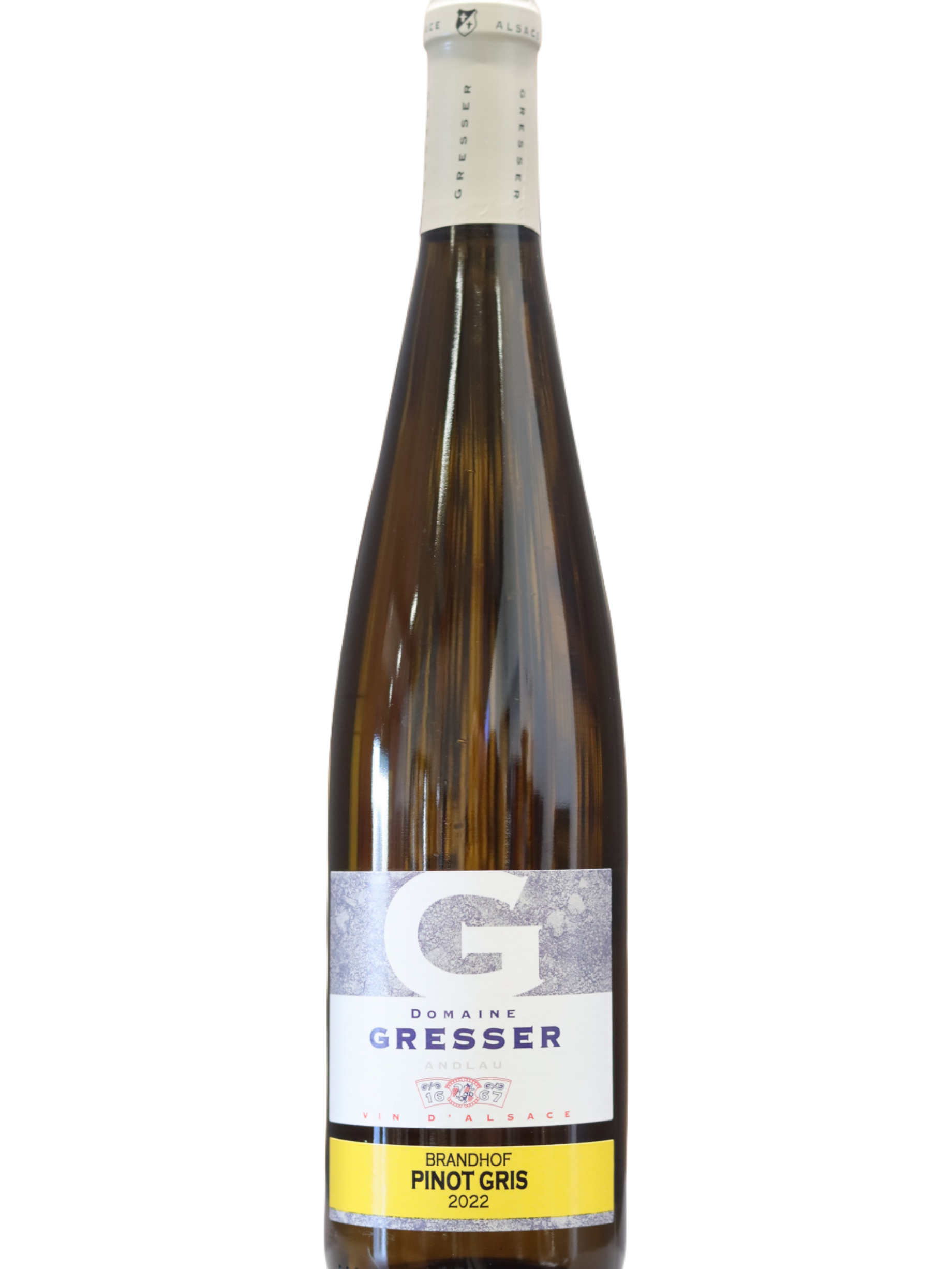 Denne hvidvin fra Domaine Gresser stammer fra Brandhof-marken i Alsace, et område der er kendt for at frembringe aromatiske og mineralske vine med stor kompleksitet. Vinen er produceret på 100% Pinot Gris, en drue der trives i de kalkholdige jorde omkring Andlau og giver en rig og karakterfuld stil.